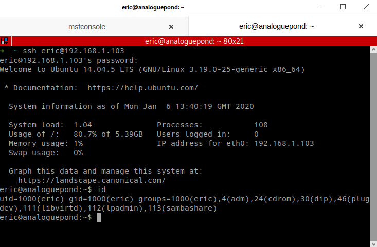 输入命令 ssh eric@192.168.1.103,发现可以登录