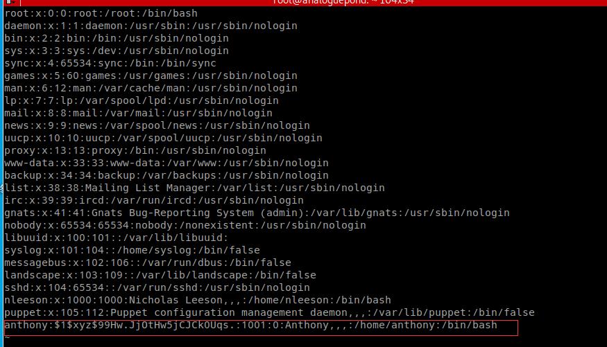 修改/etc/puppet/modules/vulnhub/files/barringsbank-passwd,密码文件,添加账户anthony,密码为之前生成的