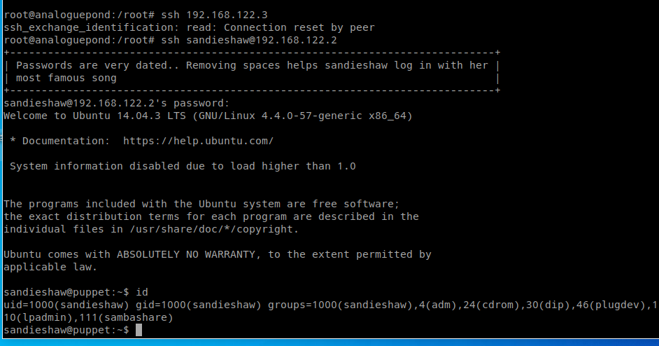 输入命令 ssh nleeson@192.168.122.3 -i nleeson_key,连接192.168.122.3这台机器,提示需要密码,输入密码为joshua,也就是my_world_you_are_persistent_try文件下得到的信息,连接成功