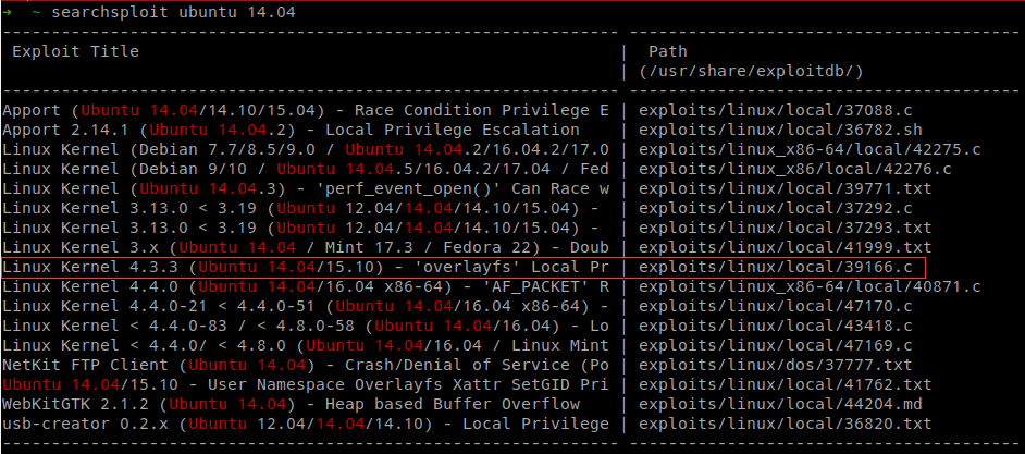 输入命令 searchsploit ubuntu 14.04,发现可用提权脚本39166.c