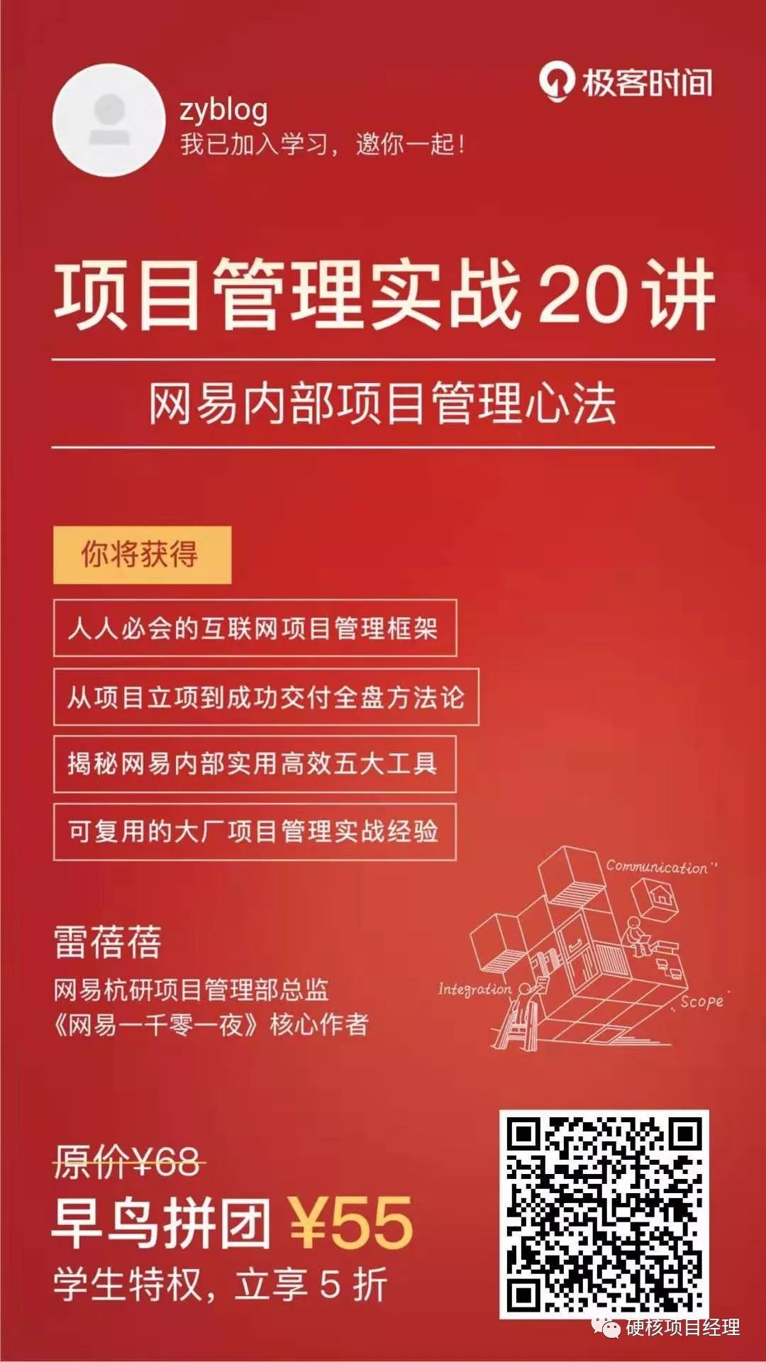 说了这么多,都是理论的东西,而且咱也没当过什么领导,正式的领导过大型的团队呀,这种理论消化起来那可是相当费劲了。没关系,网易资深的项目总监,而且还是大美女哦,雷蓓蓓老师为我们带来了网易的项目管理实践(笔者也是网易项目管理微专业的优秀学员)。雷老师的课非常生动有趣,而且最主要的是养眼~~她为我们带来了全新的《项目管理实战20讲》的课程。