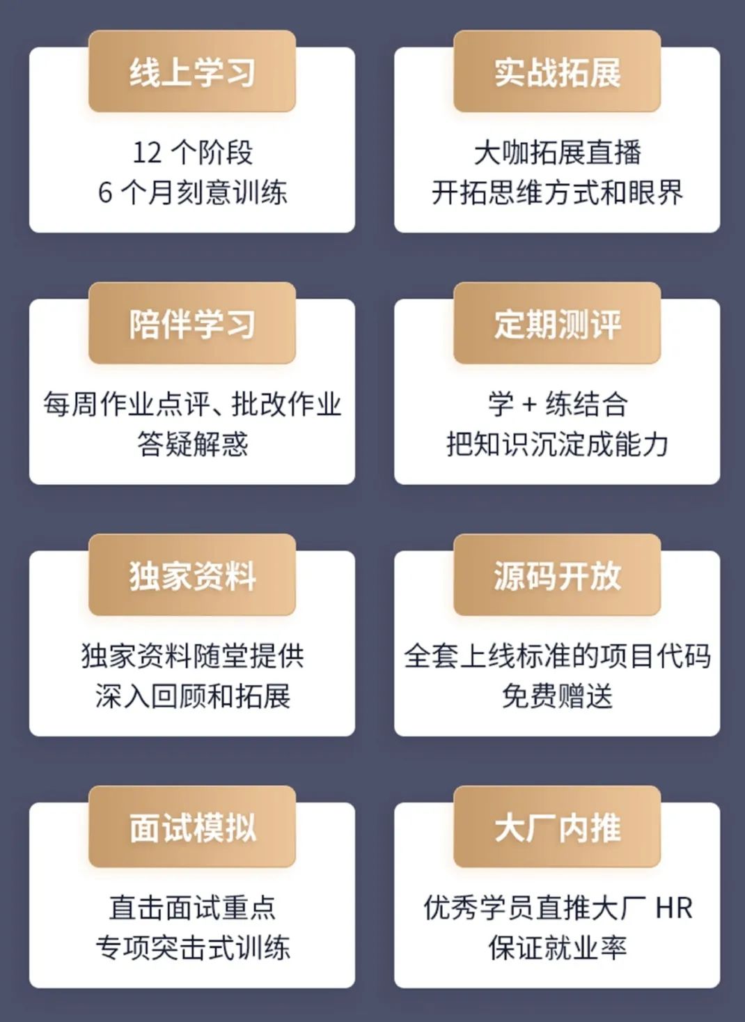 还有值得一提的是,每个阶段都会有练手项目,而且几乎都是真实项目,根据拉勾网研发团队的真实项目来进行课程化的。这一点,能帮助你快速的理解技术的应用场景。