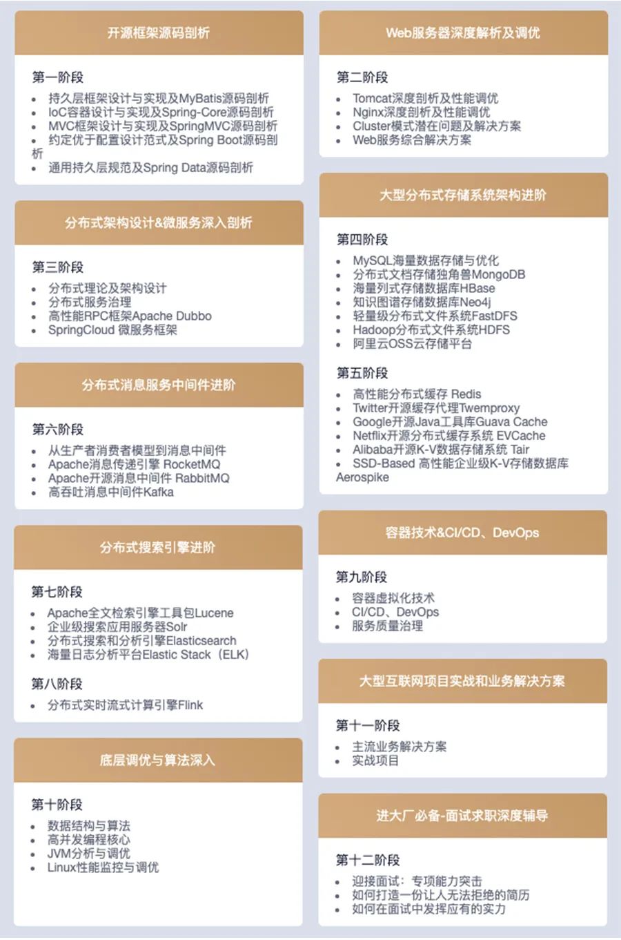 目标清晰:终极目标是达到阿里P7水平,整个学习期为6个月,共分为12个阶段,每个阶段都会有清晰的目标;