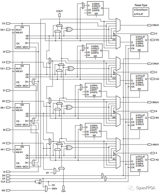 每一个CLB中包含有两个基本结构(Slice),每个基本结构中包含4个查找表(LUT)、4个存储单元、广函数多路器(Wide_function Multiplexer)和进位逻辑,这种基本结构(Slice)称为SLICEL。另外,有些基本结构(Slice)中还包含使用RAM存储数据的功能和使用32位寄存器移位的功能,支持这些功能的基本结构称为SLICEM。