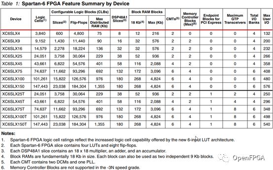 于是就可以知道 Intel 的 Cyclone IV 系列的 EP4CE15有15408个LEs;Xilinx 的Spartan-6 系列的 XC6SLX45 有 43661个LCs,就有43661 个 LUT(LEs)。
