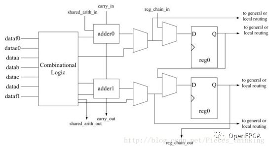每个ALM中都包含了两个可编程的寄存器、两个专用全加器、一个进位链、一个共享算术链和一个寄存器链。需要注意的是,在上图所示的组合逻辑块(Combinational Logic)中包含了两个4输入4 查找表(LUT)和4个三输入的查找表。
