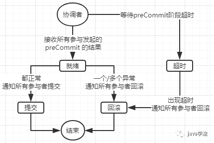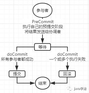 4)协调者节点受到所有参与者节点反馈的”完成”消息后,完成事务。