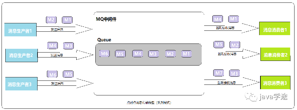 1、消息生产者将消息发送到Queue中,然后消息消费者监听Queue并接收消息;