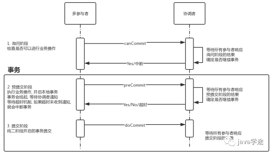 1.事务询问:协调者向参与者发送CanCommit请求。询问是否可以执行事务提交操作。然后开始等待参与者的响应。