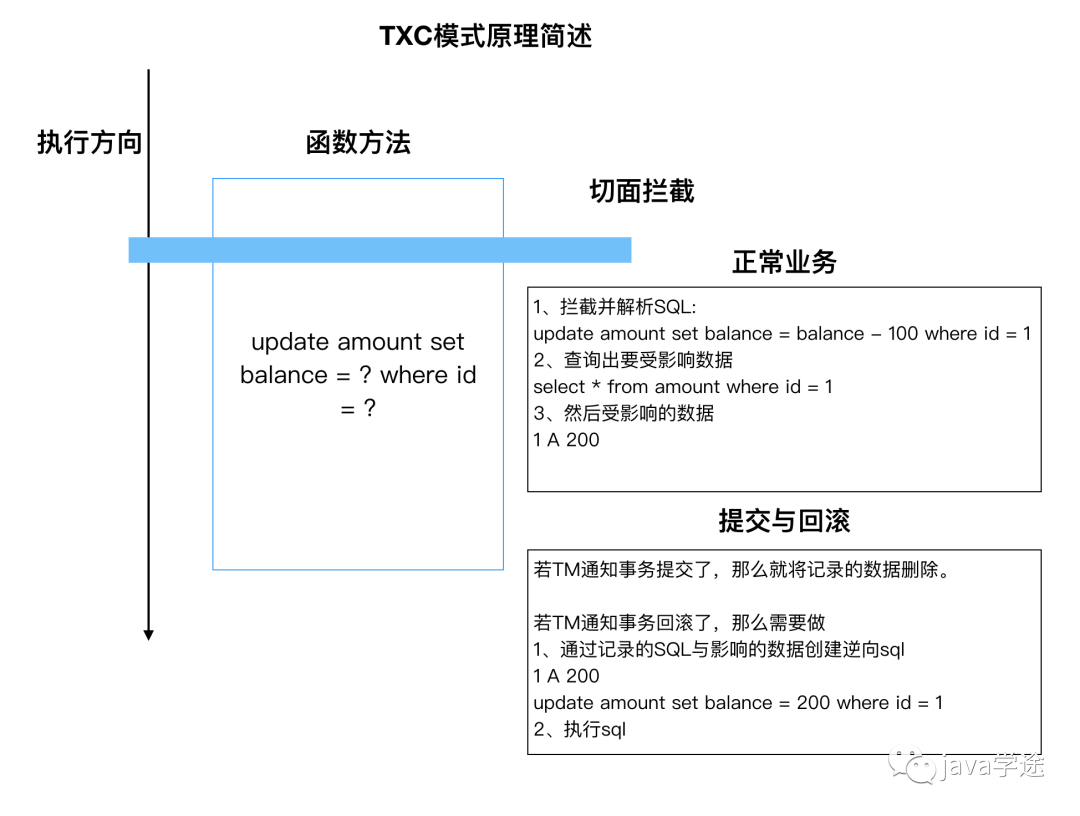 //尝试方法function try(){//记录日志todo save A 转出了 100 元todo save B 转入了 100 元//执行转账update amount set balacne = balacne-100 where id = 1update amount set balacne = balacne+100 where id = 2}//确认方法function confirm(){//清理日志clean save A 转出了 100 元clean save B 转入了 100 元}//取消方法function cancle(){//加载日志load log Aload log B//退钱update amount set balacne = balacne+100 where id = 1update amount set balacne = balacne-100 where id = 2}