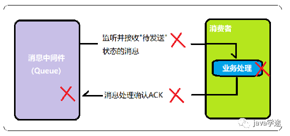 5.消费者接收到消息,业务处理完成,消息中间件受到消息处理结果,但是由于消息存储故障导致消息没能成功确认,消息会再次投递;