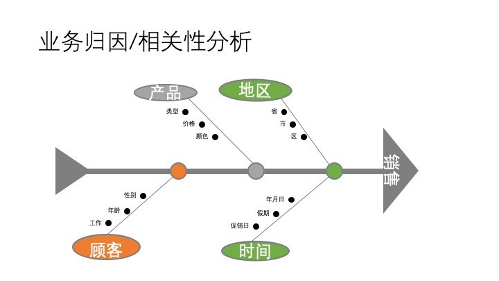 同时,每个主要的影响因子维度下,存在多种不同的粒度,比如地区可以按照省、市、区进行划分;时间可以按照季度、月度甚至节假日等进行划分。在分析业务时,可以使用鱼骨图将这些因子罗列起来。下图为使用鱼骨图做的销售主题的归因或者相关分析。