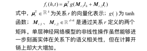 文献[57]针对上述提到的距离模型中的缺陷,提出了采用单层神经网络的非线性模型,模型为知识库中每个三元组(h,r,t)定 义了以下形式的评价函数: