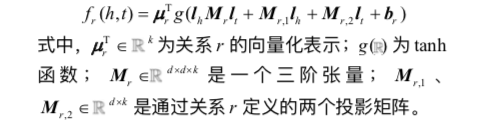 文献[61]提出的神经张量模型,其基本思想是: 在不同的维度下,将实体联系起来,表示实体间复杂的语义联系。模型为知识库中的每个三元组(h,r,t)定义了以下形式的评价函数: