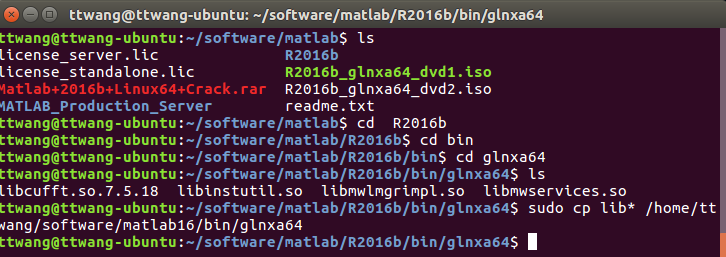 sudo cp lib* /home/ttwang/software/matlab16/bin/glnxa64/