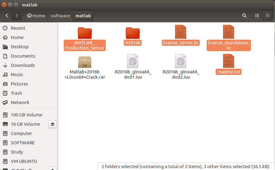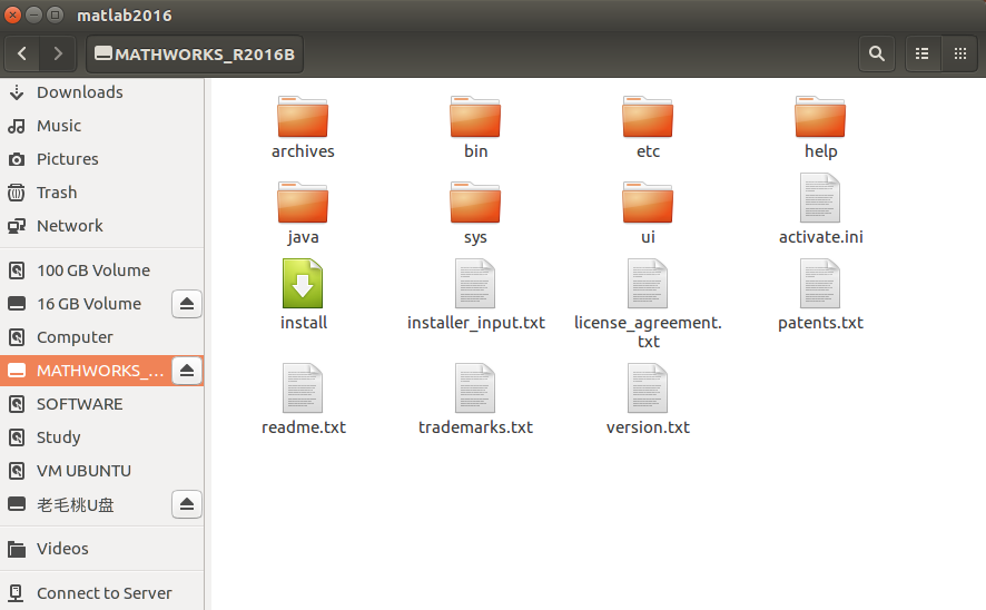 在ubuntu下安装matlab2016b,需要三个文件,分别是:Matlab+2016b+Linux64+Crack.rar 、R2016b_glnxa64_dvd1.iso 和 R2016b_glnxa64_dvd2.iso,文件比较大,可以从这个百度网盘里获取,提取码是46cx。