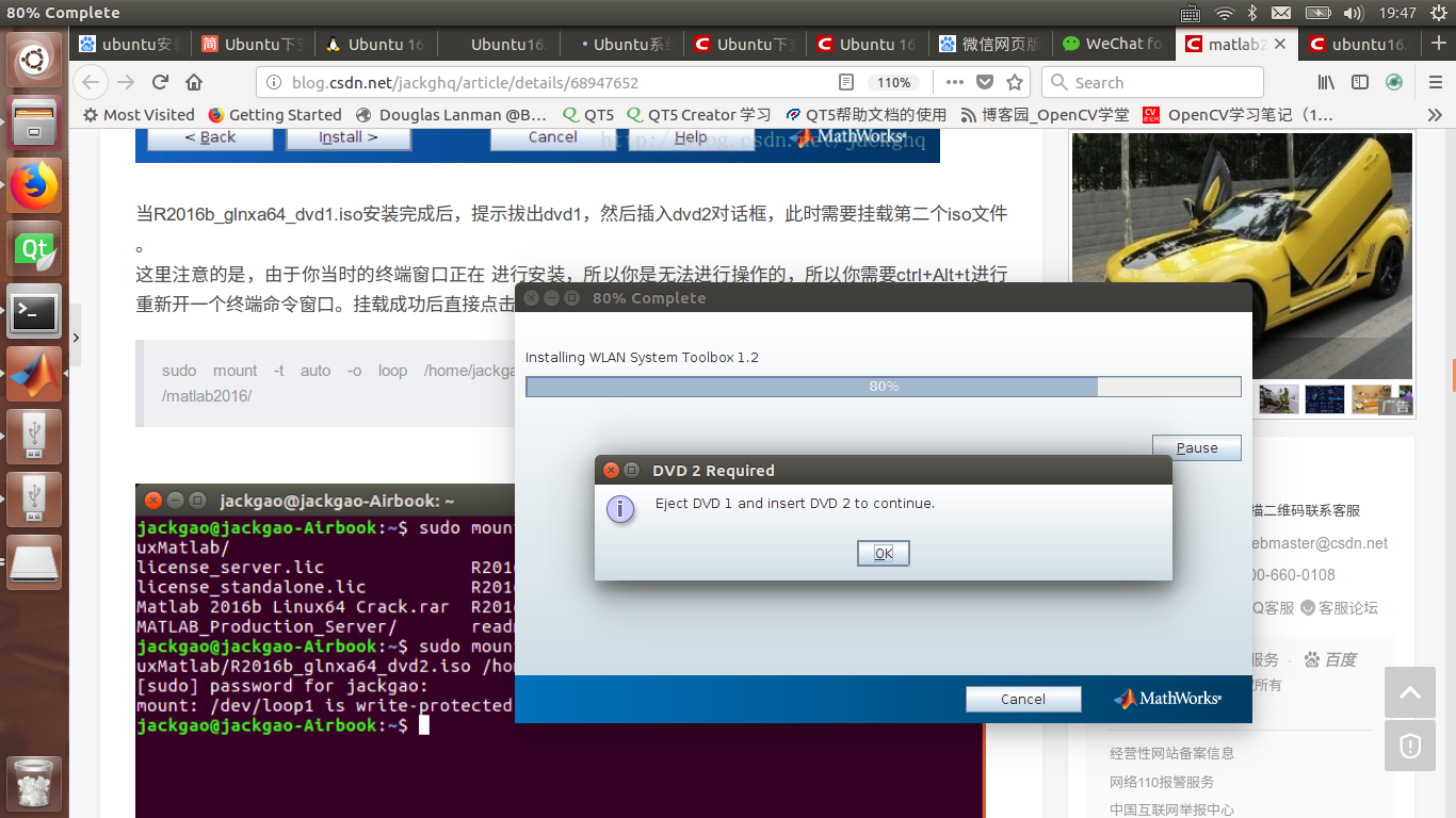 点击install,变开始安装了,当R2016b_glnxa64_dvd1.iso安装完成后,提示拔出dvd1,然后插入dvd2对话框,提示如下图: