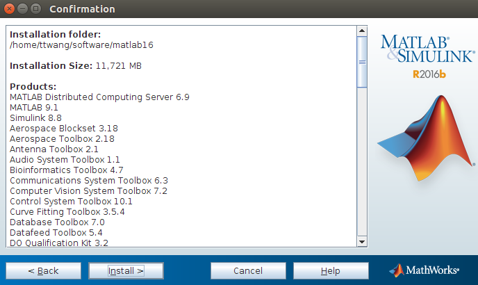 点击next,进入安装,这里我选定的安装目录是:/home/ttwang/software/matlab16 :