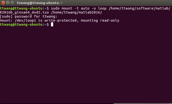 sudo mount -t auto -o loop /home/ttwang/software/matlab/R2016b_glnxa64_dvd1.iso /home/ttwang/matlab2016/
