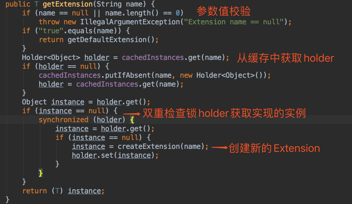 上面的源码比较简单,首先是根据传入的接口从缓存(一个以class为键,ExtensionLoader为值的concurrentHashMap)中获取,如果拿不到就放入到缓存中;逻辑比较简单,这里就不做详细分析了。接下来主要是分析:ExtensionLoader.getExtension(name)