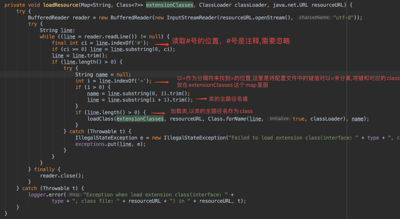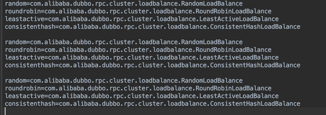 加载配置文件下的文件内容,也就是上面的com.alibaba.dubbo.rpc.cluster.LoadBalance文件