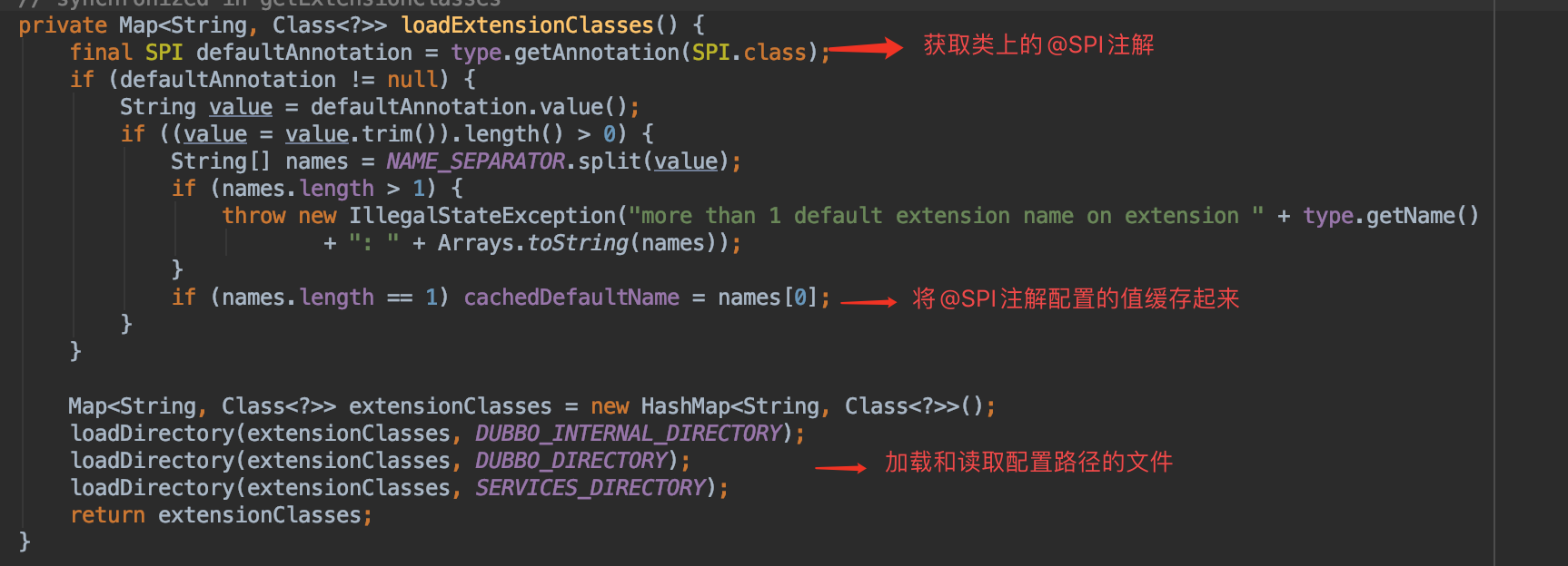 ①通过 getExtensionClasses 获取所有的拓展类,也就是所有META-INF下的配置文件中的键值对名