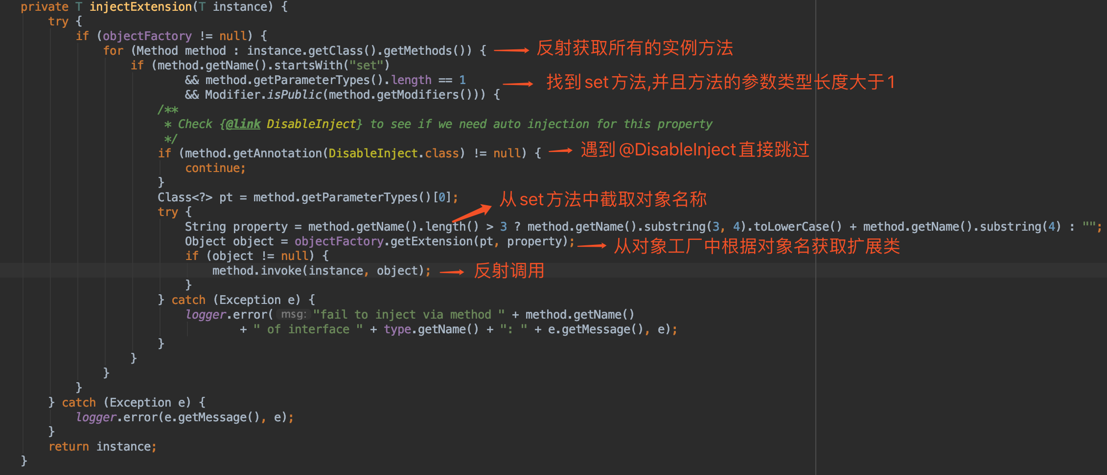 dubbo的IOC是通过setter方法来实现注入的,通过遍历对象实例的所有方法,找到其setter方法在进行截取,从objectFactory中获取扩展类再进行反射执行。这样的话,就算实现实例中有依赖的扩展实例,都可以注入完成,是dubbo的IOC体现。ojectFactory 变量的类型为 AdaptiveExtensionFactory,AdaptiveExtensionFactory 内部维护了一个 ExtensionFactory 列表,用于存储其他类型的 ExtensionFactory。