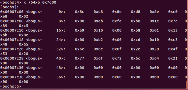 x /64xb 0x7c00 查看内存 64为sequence长度,x为16进制显示,b为长度为byte