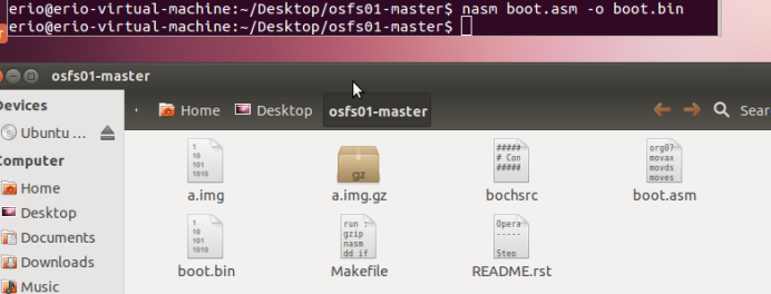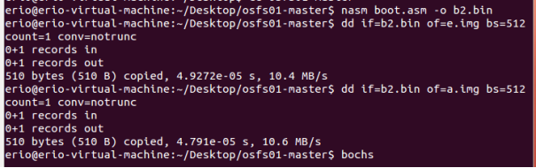 意为:先解压a.img.gz,然后汇编编译boot.asm,然后用boot.asm填充a.img,然后运行bochs