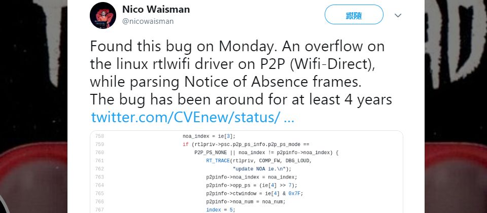 Waisman向Ars Technica透露,这是个严重的漏洞,代表Linux装置只要使用了RTLWIFI,就可被远程黑客由Wi-Fi造成系统的缓冲区溢位。