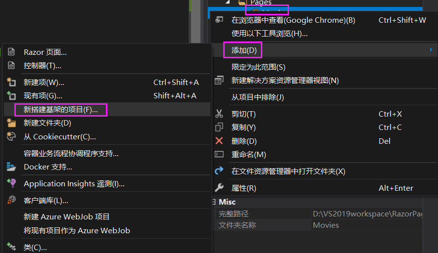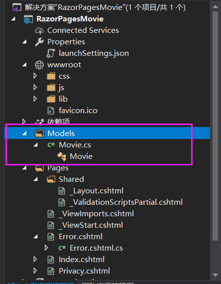 1、右键单击“RazorPagesMovie”项目>"添加">"新建文件夹"。并命名为“Models”