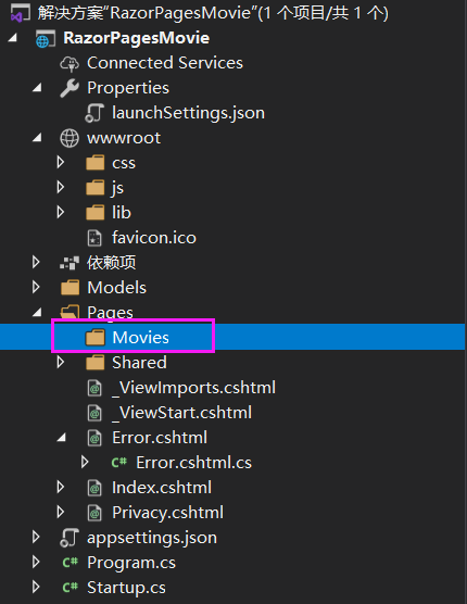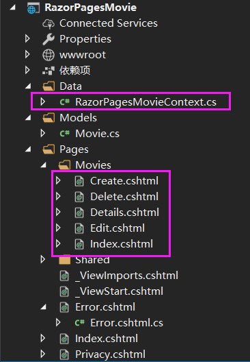 ② Pages/Movies文件夹中,新增了5个文件(Create.cshtml、Delete.cshtml、Details.cshtml、Edit.cshtml、Index.cshtml),分别表示创建、删除、详细信息、编辑和索引