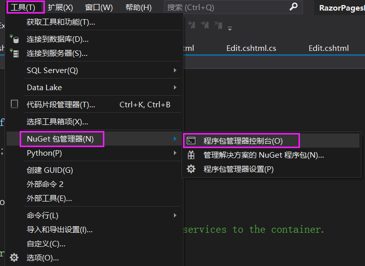 ① “工具”>“NuGet包管理器”>“程序包管理器控制台”: