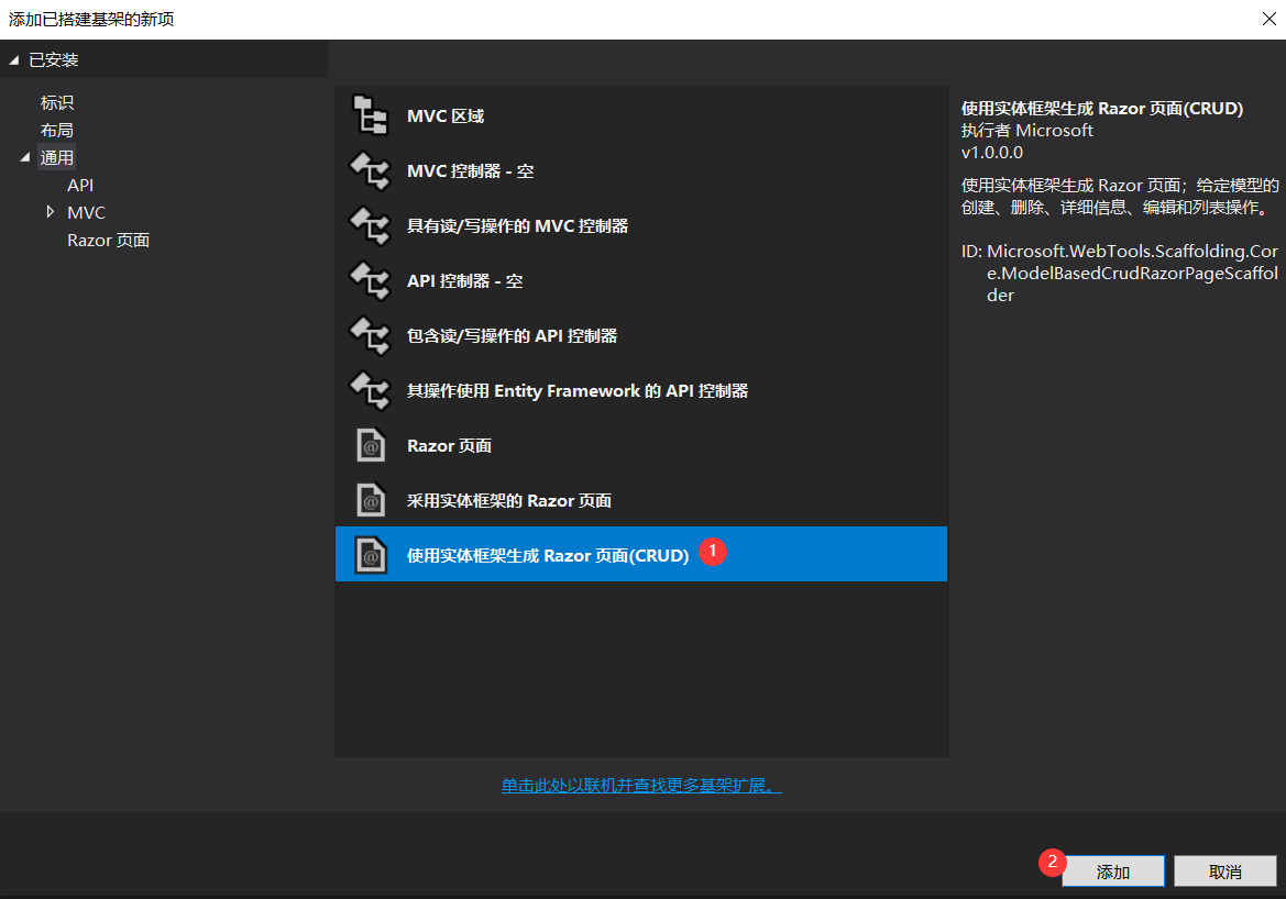 在弹出的“添加已搭建基架的新项”对话框中,选择“使用实体框架生成Razor页面(CRUD)”之后,点击“添加”:
