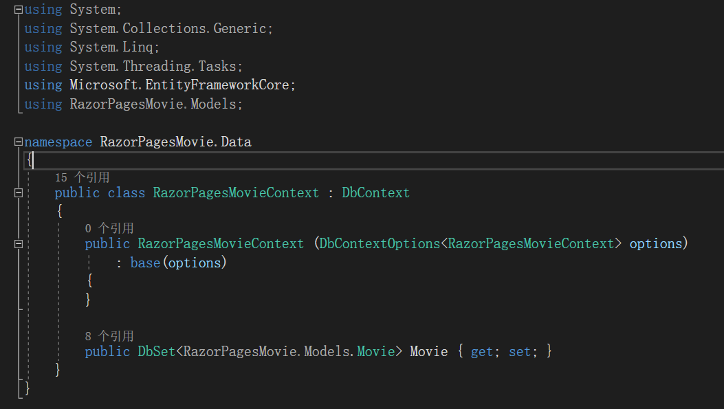 ② /Data/RazorPagesMovieContext.cs文件为Movie模型协调EF Core 功能。它派生自Microsoft.EntityFramworkCore.DbContent。数据上下文指定数据模型中包含哪些实体: