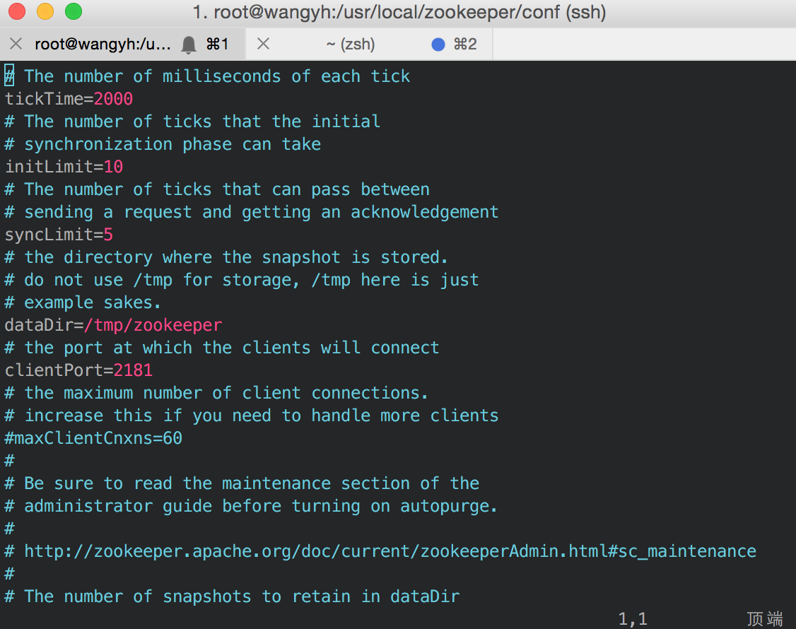 - 配置zookeeper的数据目录:dataDir=/usr/local/zookeeper/dataDir