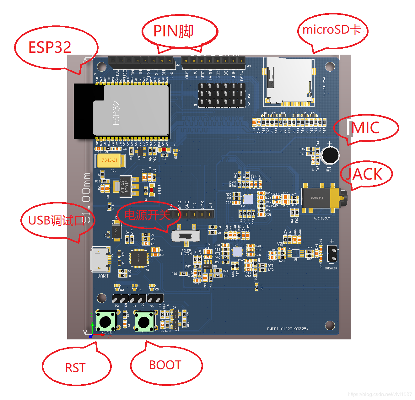 这里我们详细介绍MEGA ESP32的各个部分(图的标注部分)的硬件资源,我们将按逆时针的顺序依次介绍