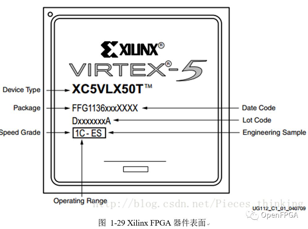 Xilinx的ug112第一章中介绍了Xilinx公司的FPGA命名规则。一般而言,大的FPGA的上表面是这个样子的: