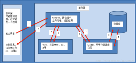 从流程图中可以看出,客户端发出请求到服务器,服务器处理请求,然后与数据库交互,提取数据,返回到服务器,服务器处理后发送给客户端,客户端接收,渲染到页面上。这就是MVC的流程,他的层次分明,耦合度低,前后端分离。