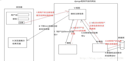 MVT的处理过程: Django框架接收了用户请求和参数后,通过正则表达式匹配URL,发送到对应视图进行处理,处理完毕后,视图调用M处理数据,再调用T返回界面给浏览器,然后显示到页面上。如下图所绘: