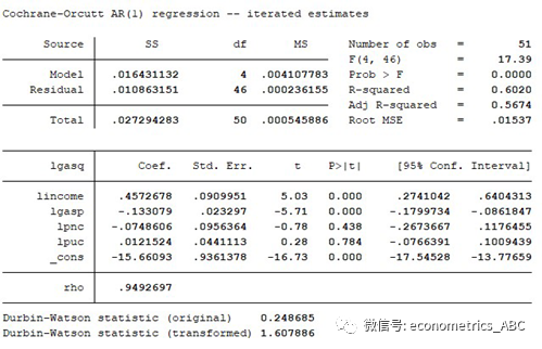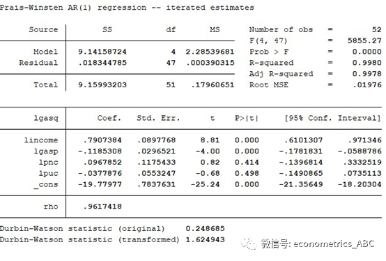 使用迭代式PW估计法进行FGLS估计(不加corc,即为默认PW估计法)