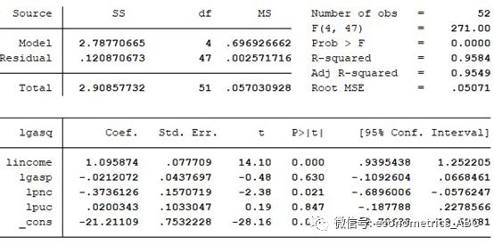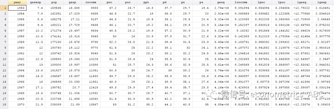 仍然选取美国汽油需求数据gasoline.dta作为示例,其样本有52个,数据展示如下:
