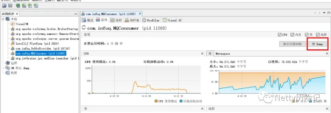 所有的都启动完成之后, 借助JDK自带的jvisualvm.exe工具观察MQConsumer的堆栈信息.
