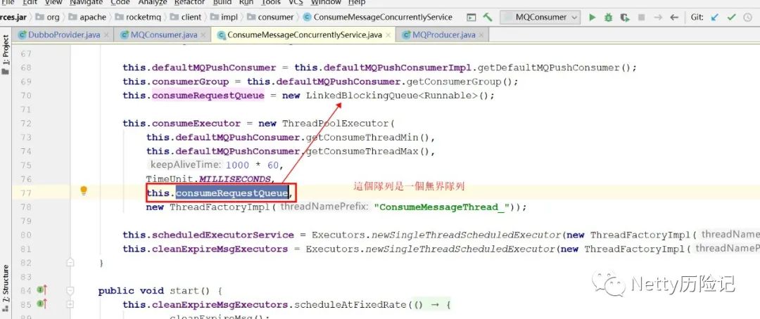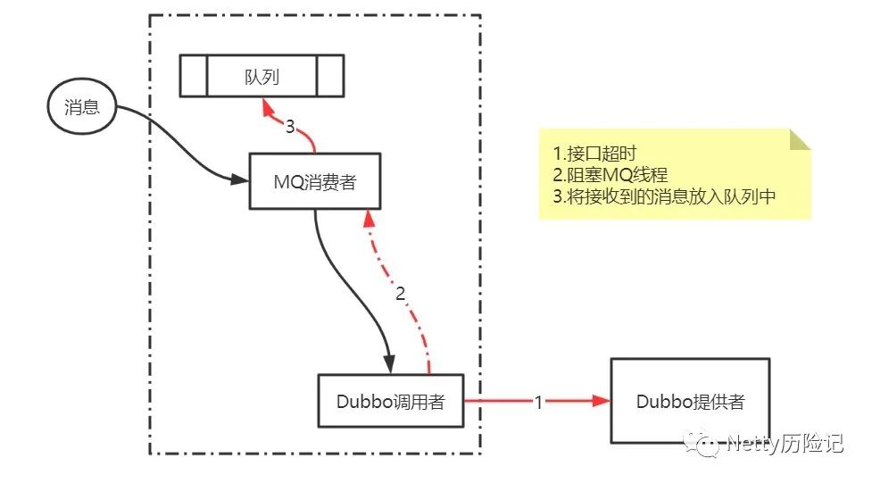 Dubbo接口调用超时也是经常会发生的事情,这篇文章中,我们模拟的情况是,让Dubbo接口调用超时,图中红线所示.然后一直向MQ消费者发送消息,我们观察线程和堆栈的变化.