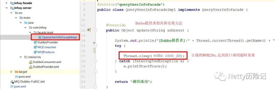 而在提供者的实现方法中,让线程睡眠20秒,从而达到调用者调用接口超时目的.如下图