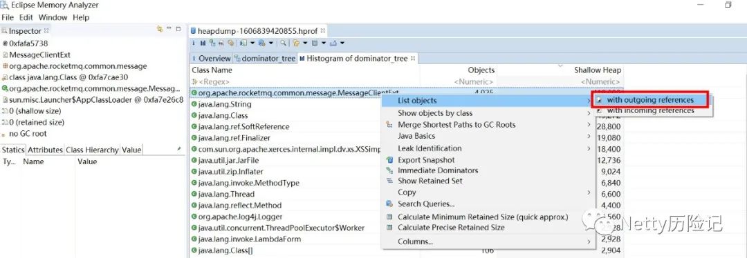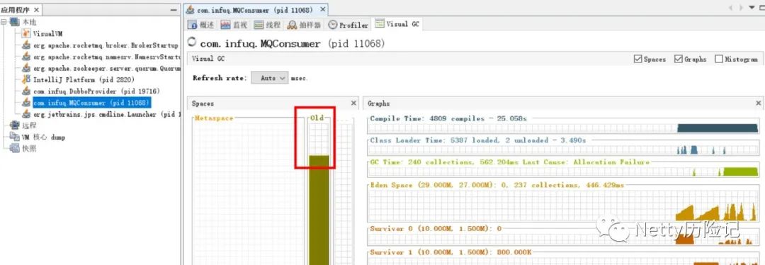 观察MQConsumer的堆栈信息,会发现老年代会一直增长,当老年代快增长到顶端时,手动dump堆栈信息,用于接下来分析堆的情况.