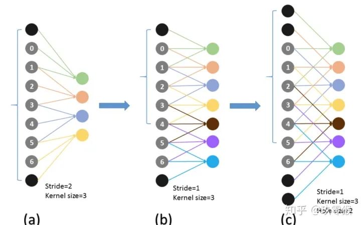 图3 一维版的普通卷积(a、b)和空洞卷积(c),黑色的圆表示填充部分,a、b、c它们相互独立进行卷积 (来自[8])