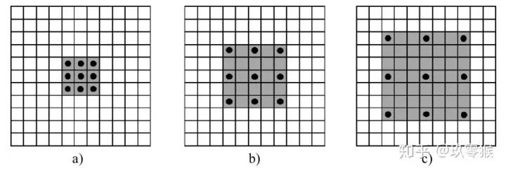 a是普通的卷积过程(dilation rate = 1),卷积后的感受野为3