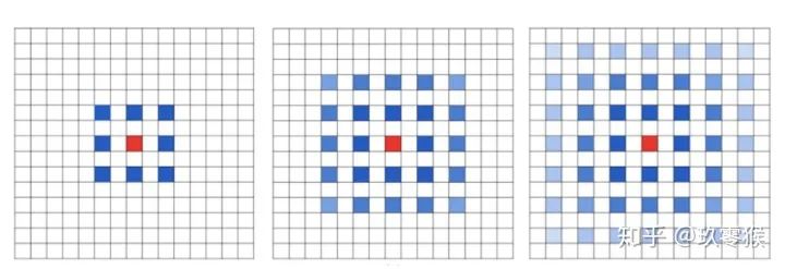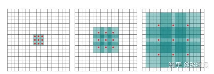 图4 三个不同的空洞卷积,卷积核的kernel size=3, stride=1, 但是空洞卷积的dilation rate分别是1,2,4。默认初始化感受野是1。(来自[1])