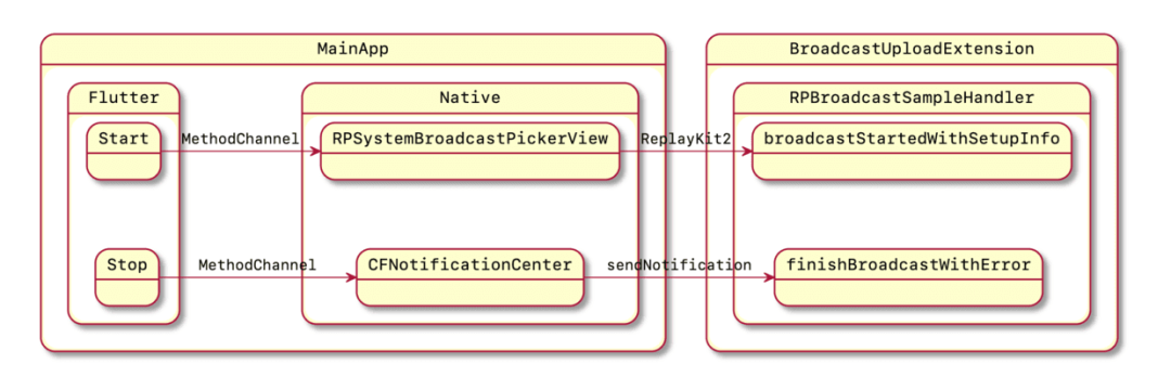 首先需要处理主 App 进程与 ReplayKit 子进程的跨进程通信问题,由于屏幕采集的 audio/video buffer 回调非常频繁,出于性能与 Flutter 插件生态考虑,在原生侧处理音视频 buffer 显然是目前最靠谱的方案,那剩下要解决的就是启动、停止信令以及必要的配置信息的传输了。